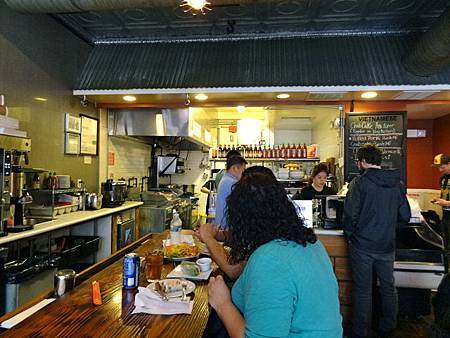 店裡摩登(好老派的字眼)的裝潢以及咖啡吧台其實難以讓人聯想這是一間越南餐廳,但後頭那一排sriracha辣醬已經洩了底。